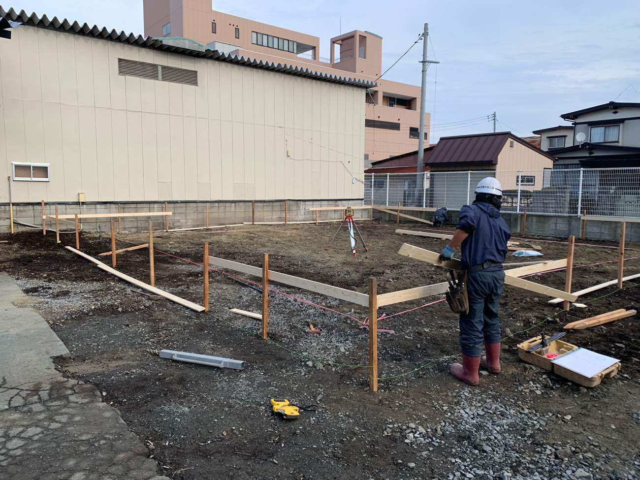 建物の位置・高さの基準点となるBM(ベンチマーク)の設定と申請通り位置が出ているかの確認を行い、来月からいよいよ着工となります。